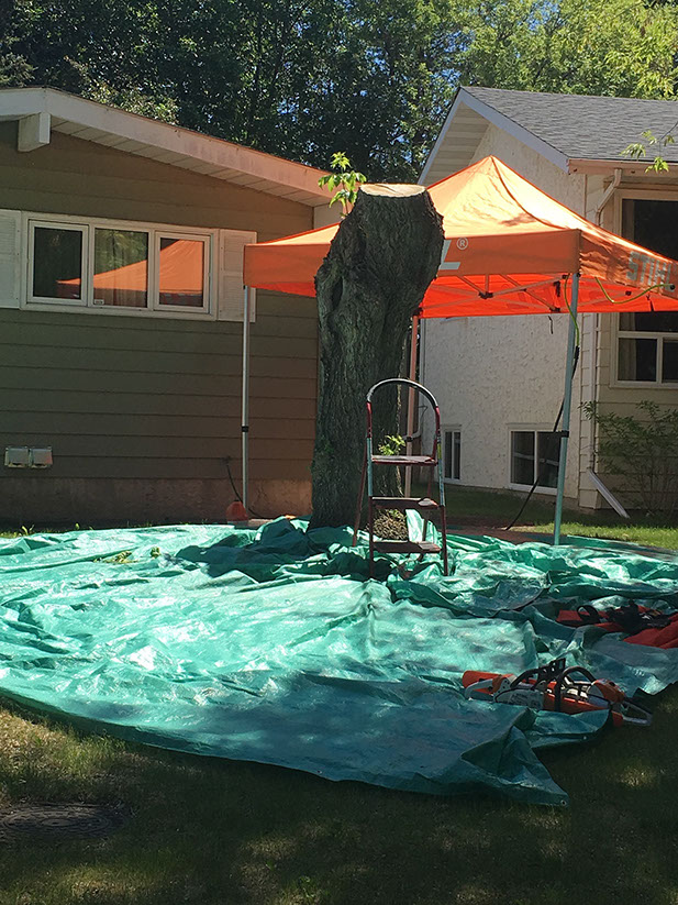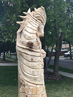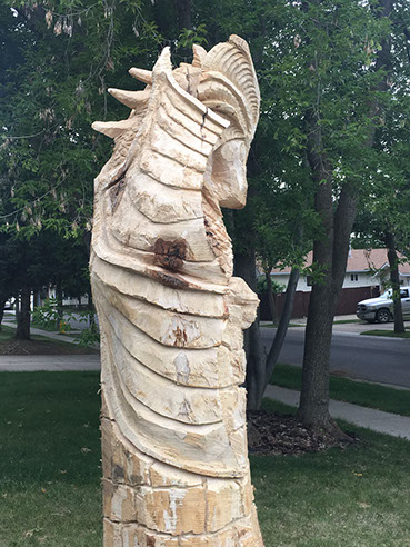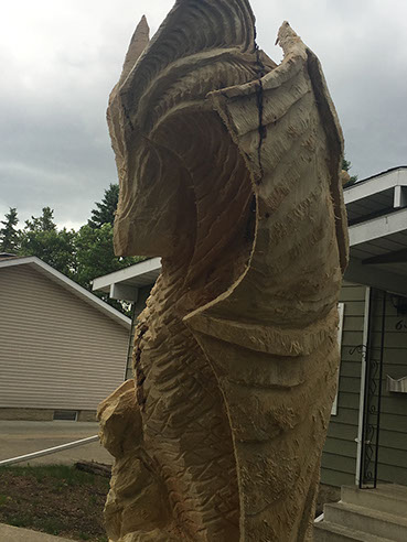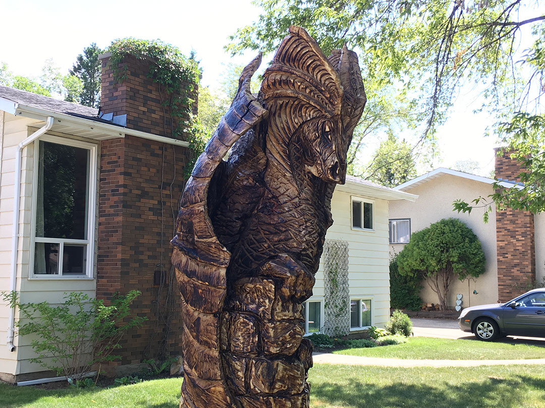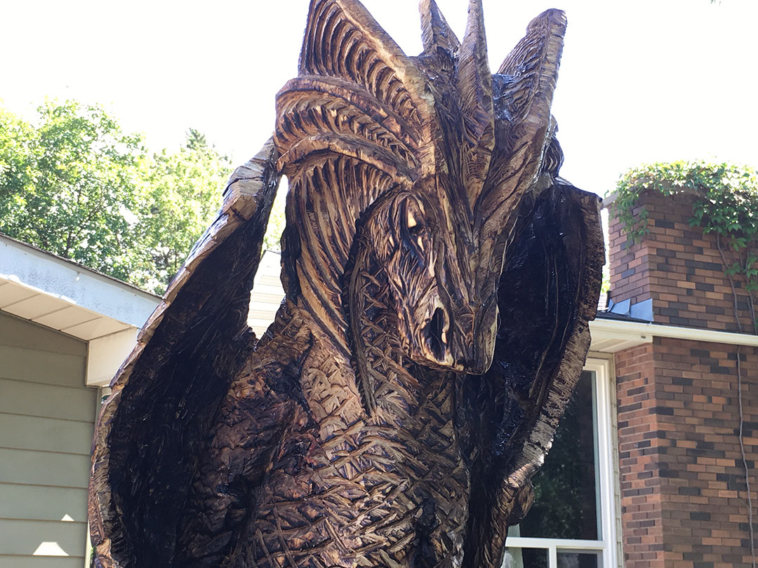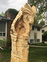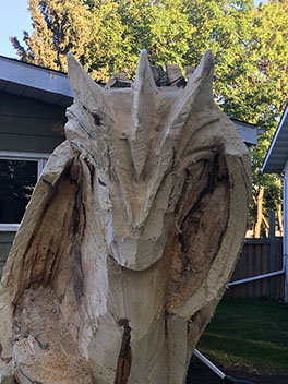 I got a random call from a homeowner that was thinking about having a carving made from his big old Maple that had to be cut down but he just wasn't quite sure what he wanted. Me, I've always wanted an excuse to play with dragons so an offer was tabled and the project was born. And boy did this dragon fight hard. Maple is a wood to be respected - and then slain with a sharp, sharp saw.