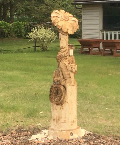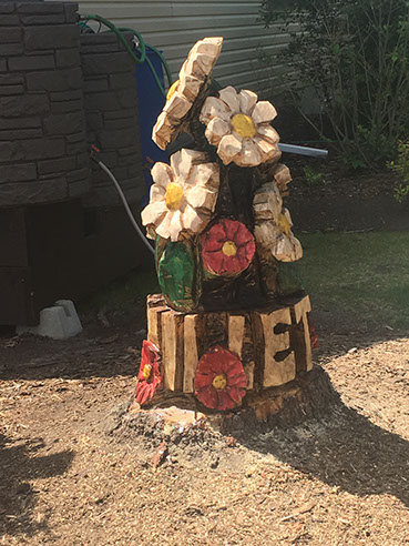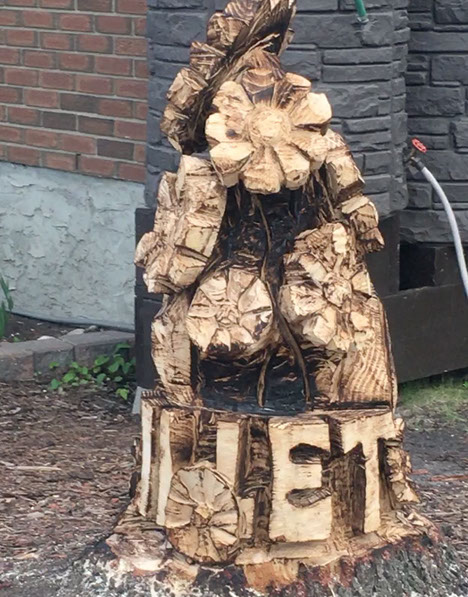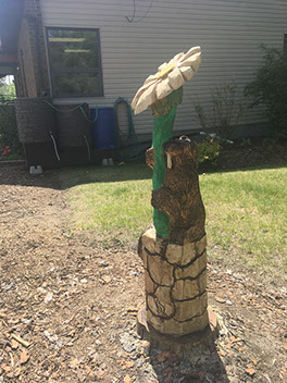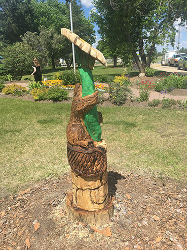I was chosen by the Communities in Bloom organizers for Millet to come tend to two stumps just outside their visitor center that they had earmarked for a chainsaw carver. We split the job over two sessions - one very long day to carve and the second day to get some colour into things. These carvings will greet visitors and residents for years (and years) to come. It was so great to be so welcomed and appreciated in Millet - thank you all!