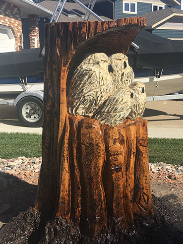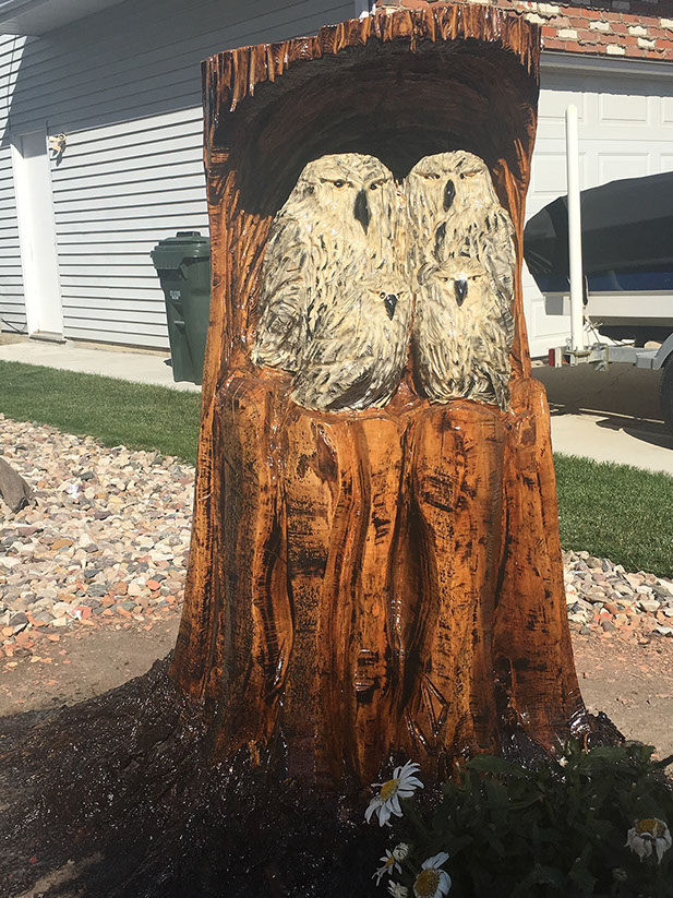 I'll never forget the day I met this homeowner. I was working in my shop and I heard someone shout "You're my knight in shining armor!" She was talking to me and was referring to the fact that they had had a special tree cut down but had left a large stump behind knowing that one day, some where she would find me and could get me to come carve her family of snowy owls.