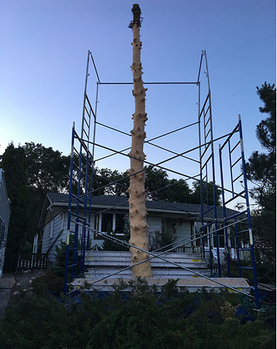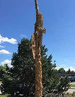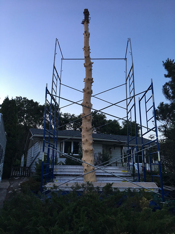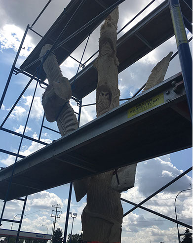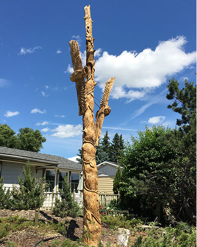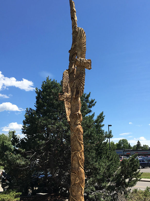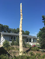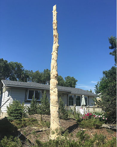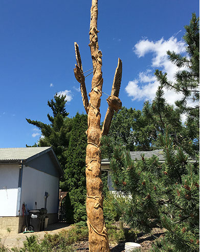 Commissioned to commemorate the homeowner's 60th wedding anniversary in conjunction with Canada's 150th. The carving features six burrowed owlets protected by the soaring guardians each with wingspans of seven feet. The two top most owlets, nearest to heaven represent two of the children who have passed on before their time. Each owlet and the soaring guardians are connected by the vine that wraps its way from earth right up to the heavens. And to those beings able to look down upon the carving you will find a heart staring straight up from the top of the main trunk.