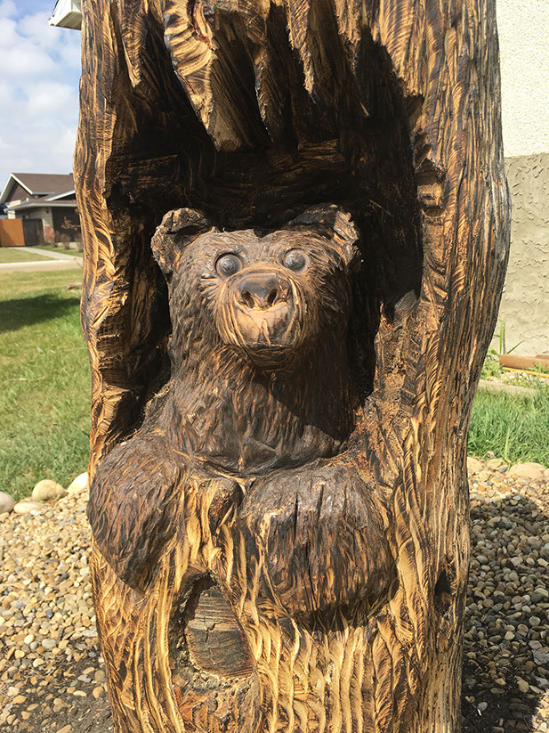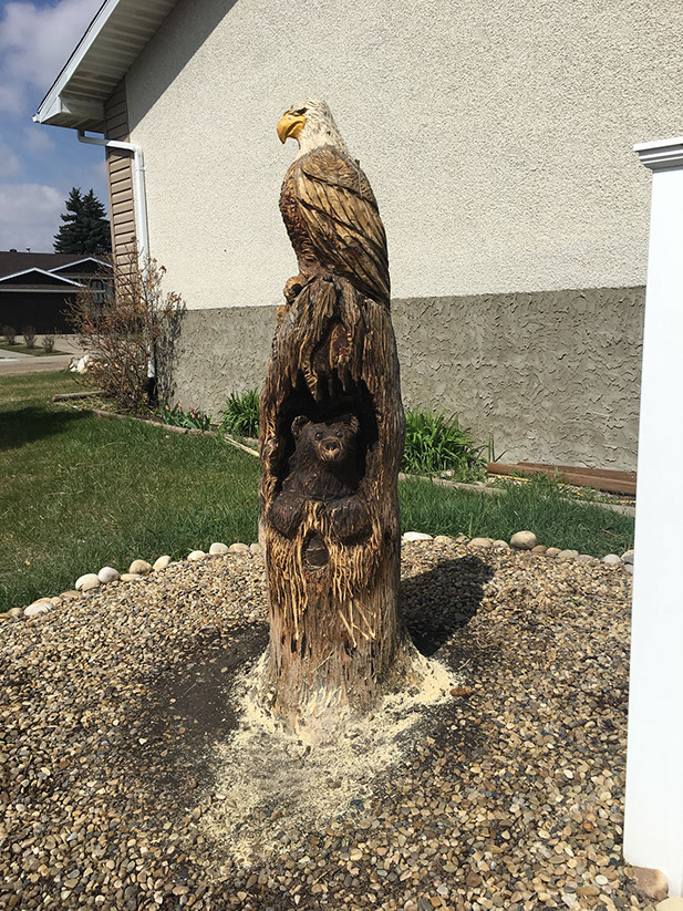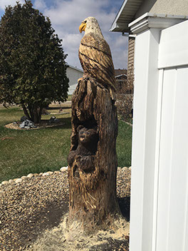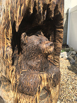 It was an absolute pleasure to work on this piece which we completed in two carves. The eagle came first and I'll never forget how exited the homeowner was when I suggested he could paint it if he wanted. And a fine paint job it was! We reconnected the following season to get the bear in and to complete the vision the homeowner had all along. A neighborhood delight.