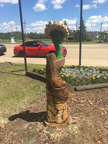 I was chosen by the Communities in Bloom organizers for Millet to come tend to two stumps just outside their visitor center that they had earmarked for a chainsaw carver. We split the job over two sessions - one very long day to carve and the second day to get some colour into things. These carvings will greet visitors and residents for years (and years) to come. It was so great to be so welcomed and appreciated in Millet - thank you all!