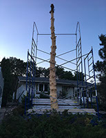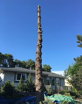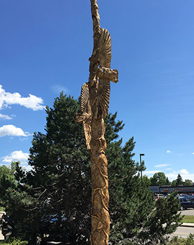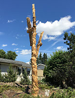 Commissioned to commemorate the homeowner's 60th wedding anniversary in conjunction with Canada's 150th. The carving features six burrowed owlets protected by the soaring guardians each with wingspans of seven feet. The two top most owlets, nearest to heaven represent two of the children who have passed on before their time. Each owlet and the soaring guardians are connected by the vine that wraps its way from earth right up to the heavens. And to those beings able to look down upon the carving you will find a heart staring straight up from the top of the main trunk.