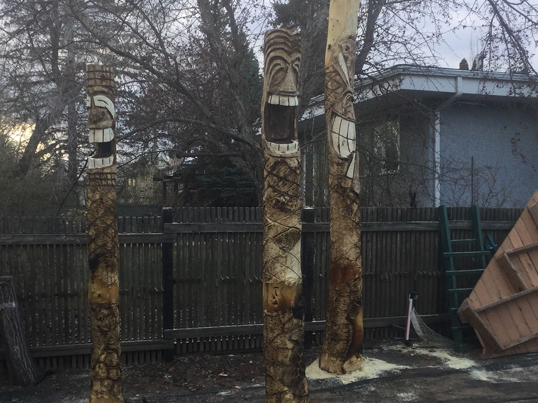 In the running for parents of the year, I was contacted by these homeowners who needed to cut down the trees holding up their children's treehouse but wanted to keep the trees (and treehouse) and asked if I had any ideas. The family, having recently returned from a Hawaiian getaway were head over heels for the idea of the King, the Joker and the Bandit. Can you guess which is which?